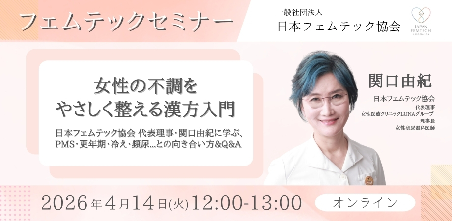 今回ご登壇いただくのは、一般社団法人日本フェムテック協会 代表理事であり、女性医療クリニック LUNAグループ 理事長、そして女性泌尿器科医として多くの女性の不調と向き合ってこられた関口由紀先生です。PMS、更年期、冷え、疲れやすさ、頻尿、尿もれなど、女性の心と体はライフステージごとにさまざまに変化します。本セミナーでは、若い世代の月経まわりの不調から、更年期、閉経後の変化まで、女性の不調に対する漢方の考え方をわかりやすく学びます。